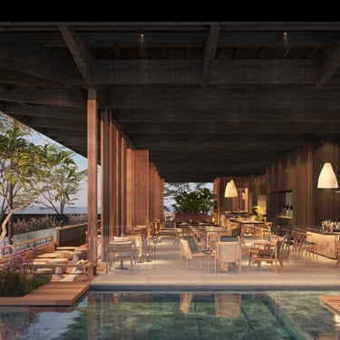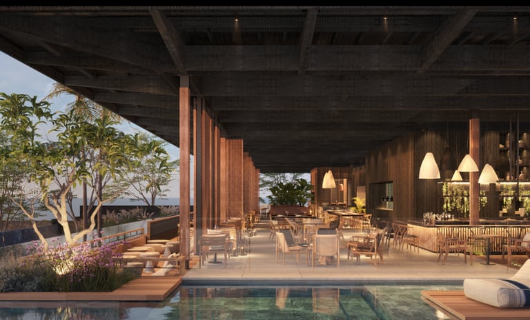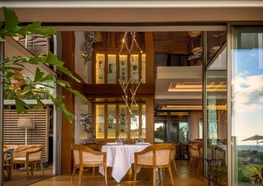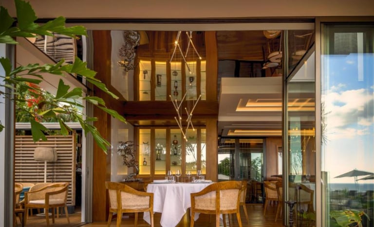 La vue est incroyable, avec l’océan juste en face. L'ambiance est très contemporaine, avec une décoration élégante et pleine de goût : bois, matières naturelles et lignes épurées créent un cadre parfait pour partager un repas avec votre moitié. Les tables sont installées au bord de la superbe et immense piscine (chauffée), ce qui rend le moment encore plus magique et romantique. Dans l’assiette, on retrouve une cuisine moderne et soignée, mettant en valeur les produits locaux avec finesse. Les plats sont élégants, bien équilibrés et parfaits pour un dîner à deux. Mention spéciale pour les desserts, excellents et gourmands, qui concluent le repas sur une très belle note.