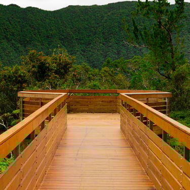 Le lieu se prête parfaitement à une pause pique-nique, éventuellement suivie d’une petite sieste à l’ombre. L’espace est équipé de tables en bois et de jeux pour enfants, idéal pour que toute la famille puisse profiter d’un moment de détente. À proximité, un mini-belvédère en bois offre une vue exceptionnelle au-dessus de la végétation et de la rivière des Marsouins. C’est l’endroit parfait pour observer la nature, prendre quelques photos et apprécier pleinement la beauté de la vallée avant de poursuivre la route vers le belvédère principal de l’usine.